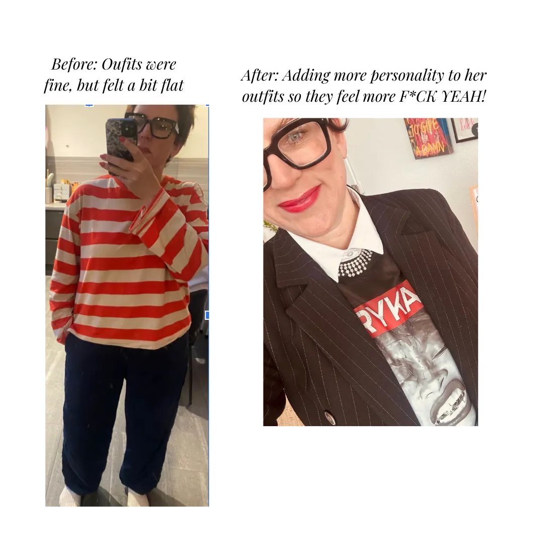 My wardrobe is now much simpler and organised around shapes that work for me. Sarah helped me develop a formula for putting outfits together that give me that “f*ck yeah” feeling — without overcomplicating things.